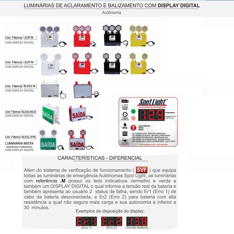 A SPot Light disponibiliza em seus equipamentos mais um recurso para contribuir na agilidade da manutenção do sistema de iluminação de emergência: o Display Digital, presente na linha Master. Localizado na tampa frontal dos equipamentos permite a inspeção visual do funcionamento das luminárias onde informa a tensão real da bateria e duas possibilidades de erros: Er1 indica cabo da bateria desconectado e Er2 indica bateria com alta resistência que não segura mais carga e cuja autonomia é inferior a 30 minutos.